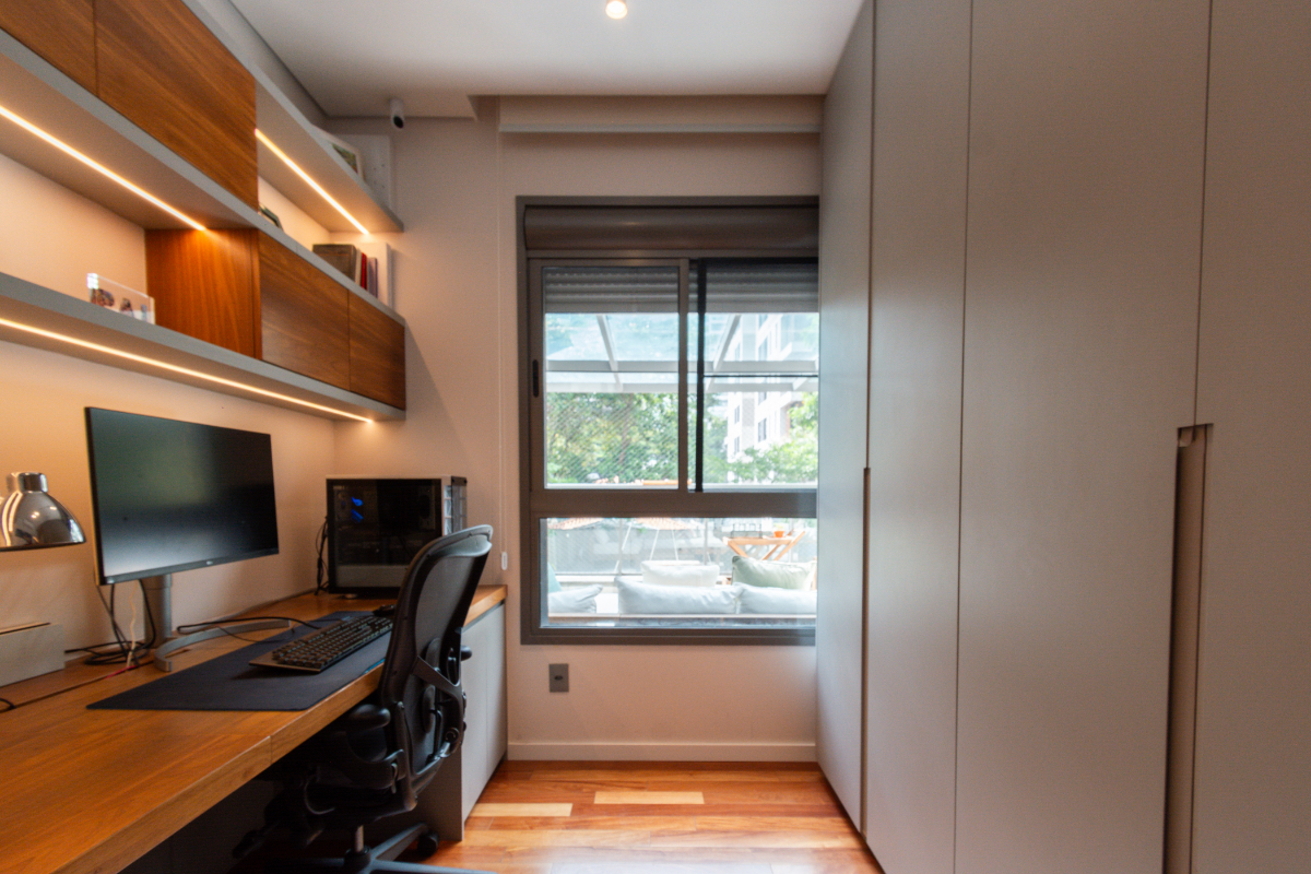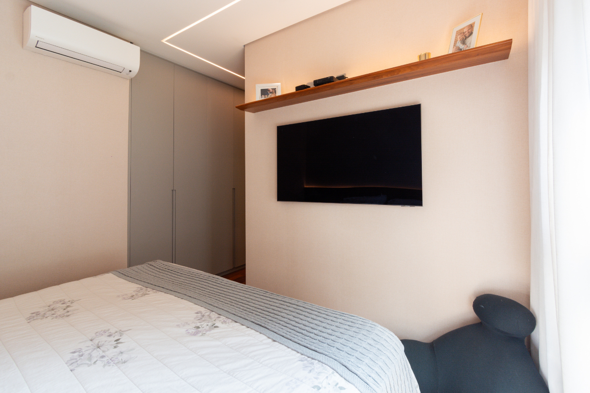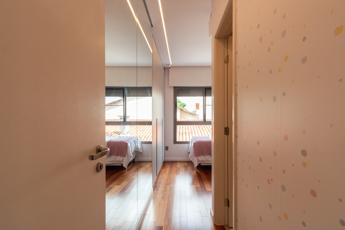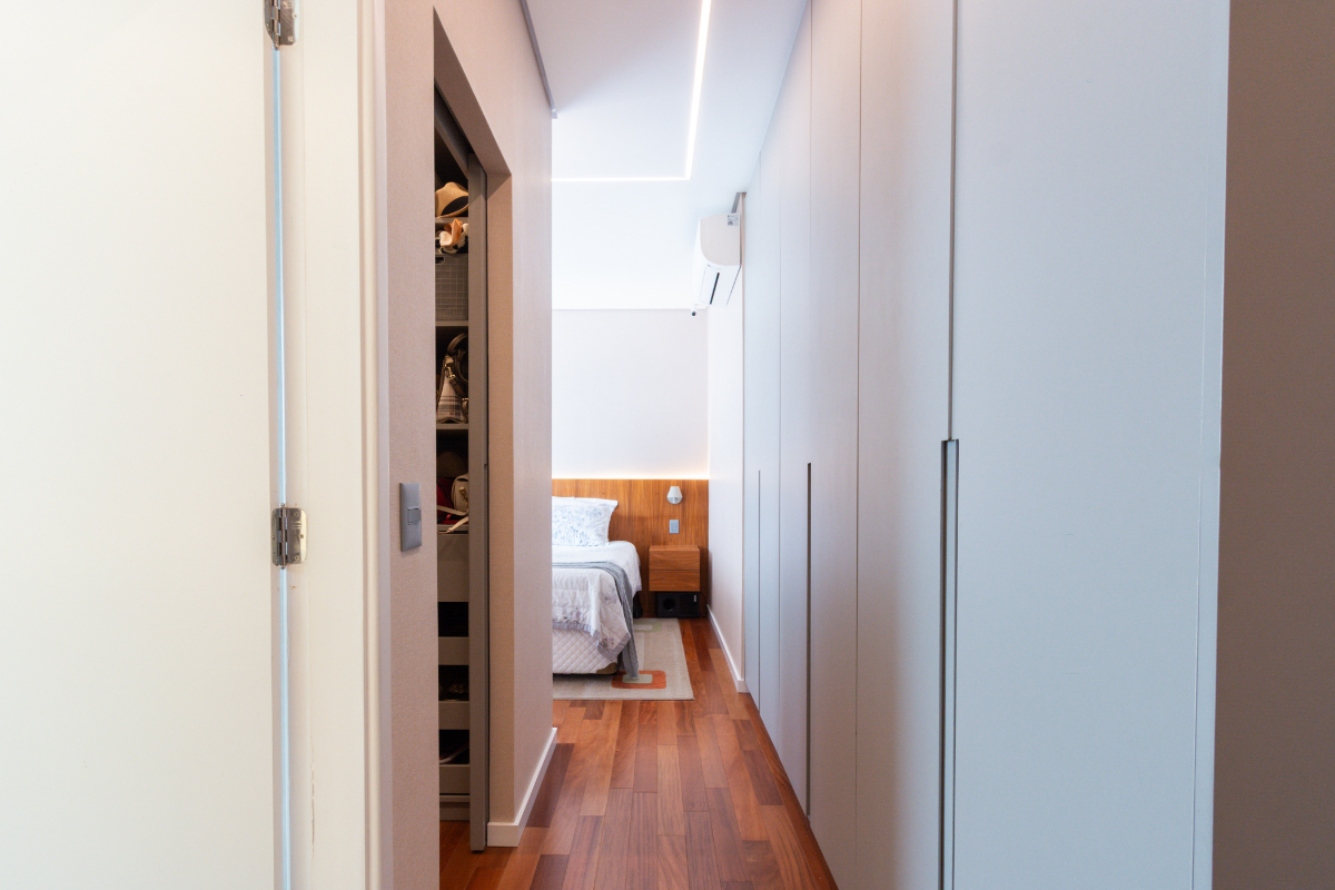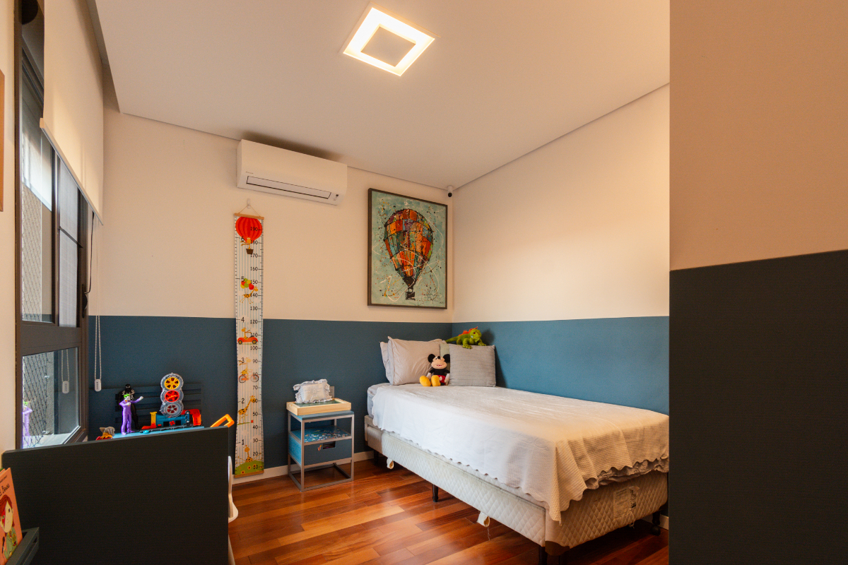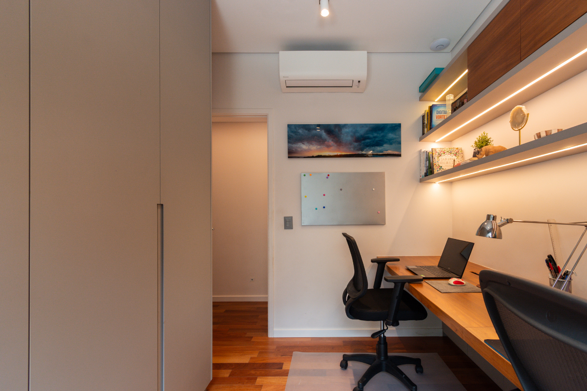Os quartos possuem piso em madeira, e o imóvel está repleto de armários planejados e ar-condicionado em todos os ambientes, garantindo elegância e conforto térmico o ano todo.