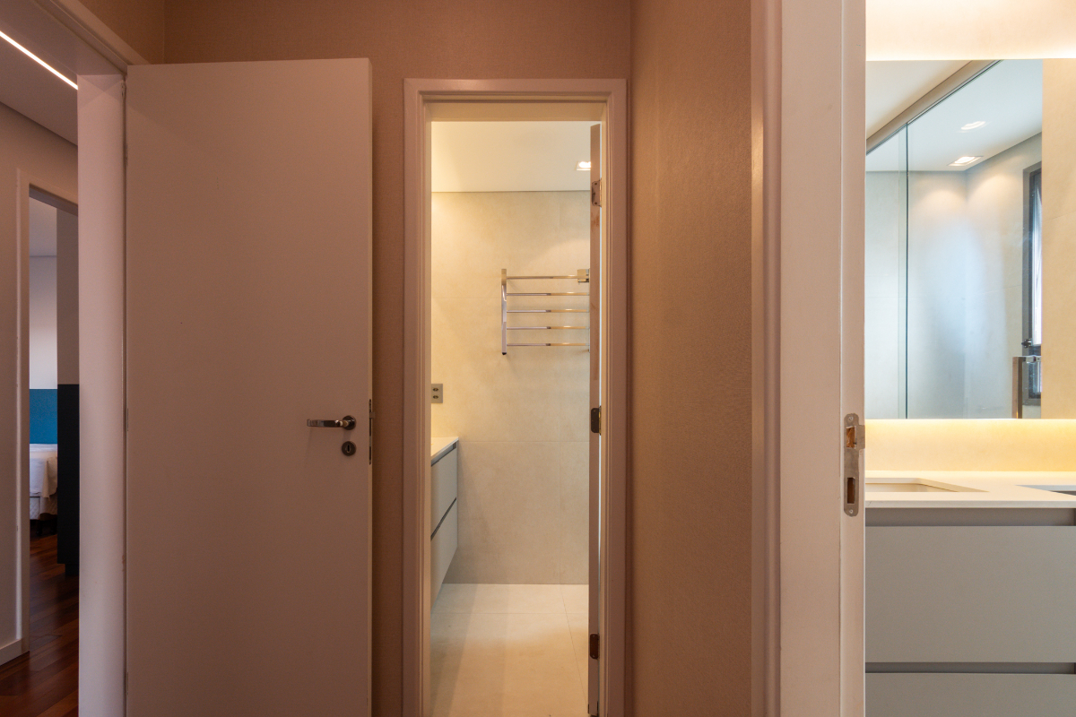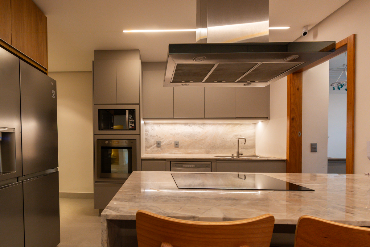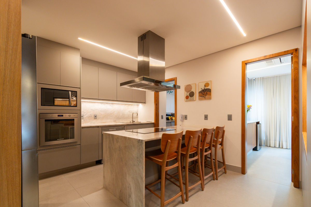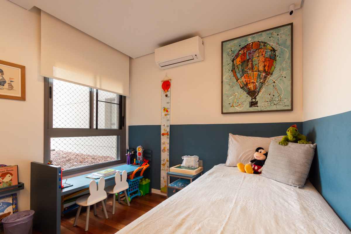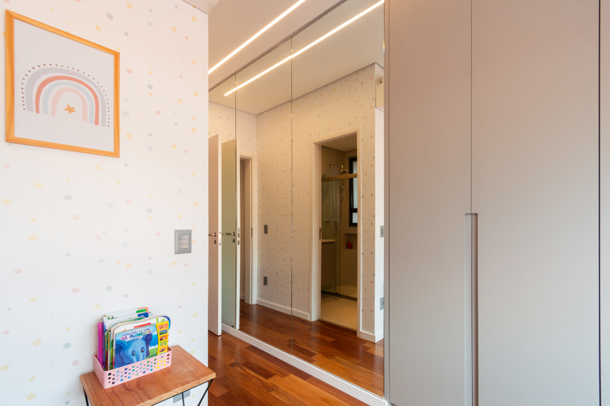 Os quartos possuem piso em madeira, e o imóvel está repleto de armários planejados e ar-condicionado em todos os ambientes, garantindo elegância e conforto térmico o ano todo.