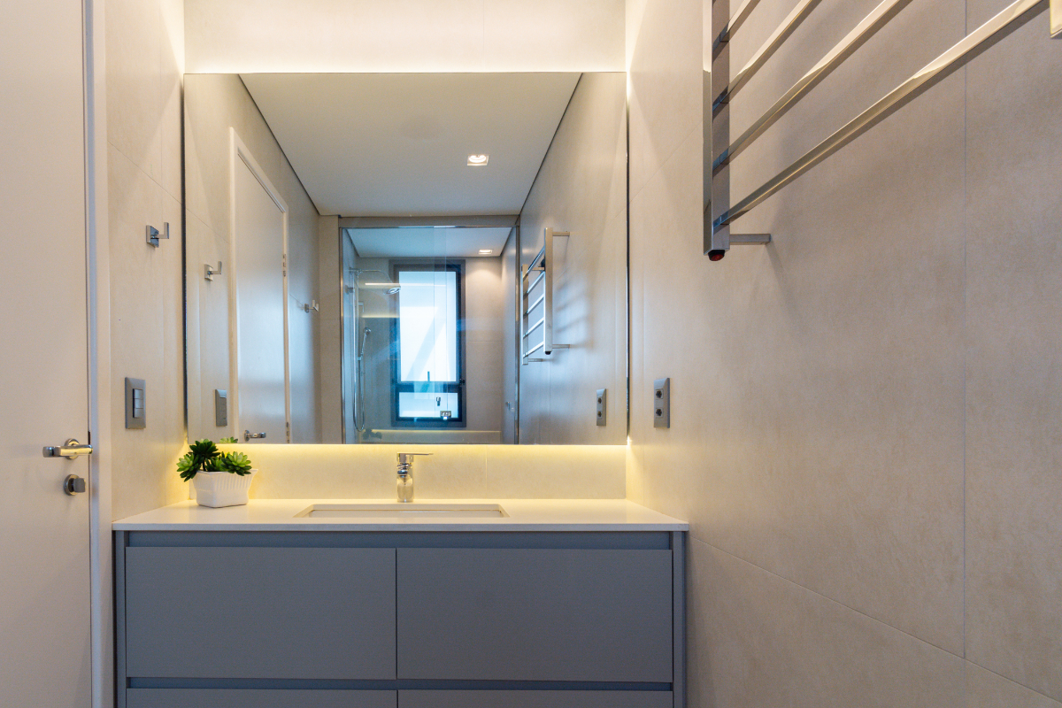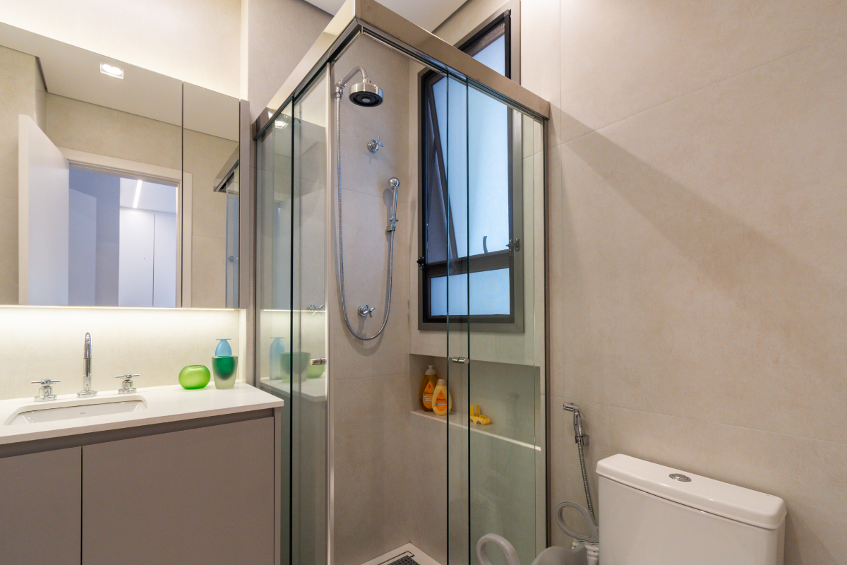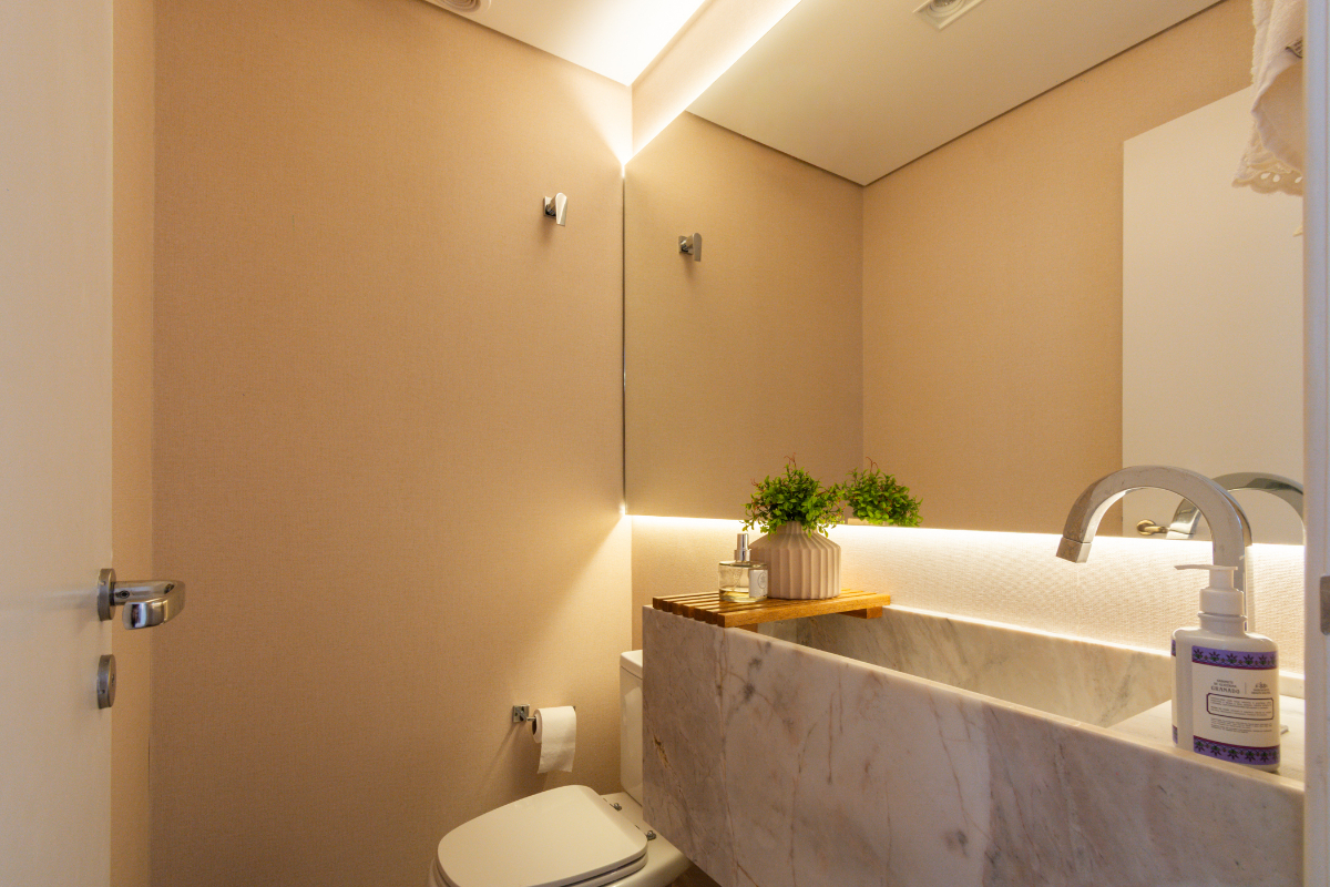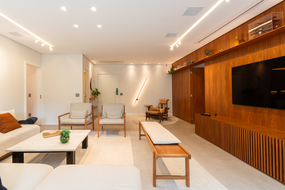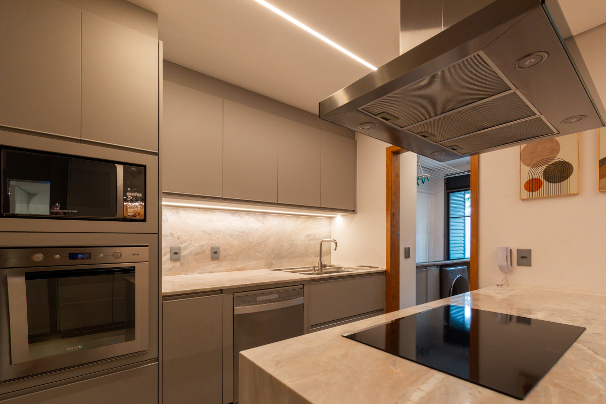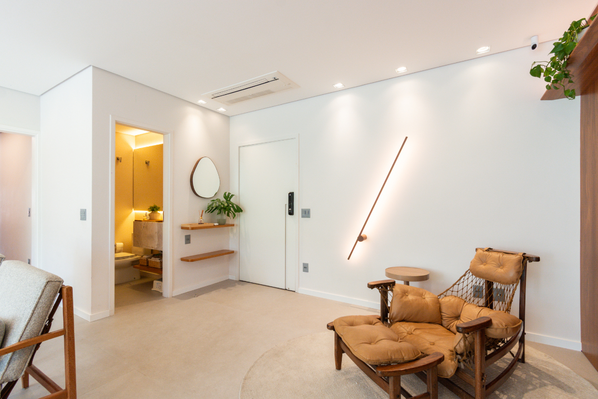 Os quartos possuem piso em madeira, e o imóvel está repleto de armários planejados e ar-condicionado em todos os ambientes, garantindo elegância e conforto térmico o ano todo.
