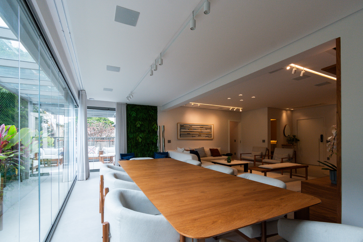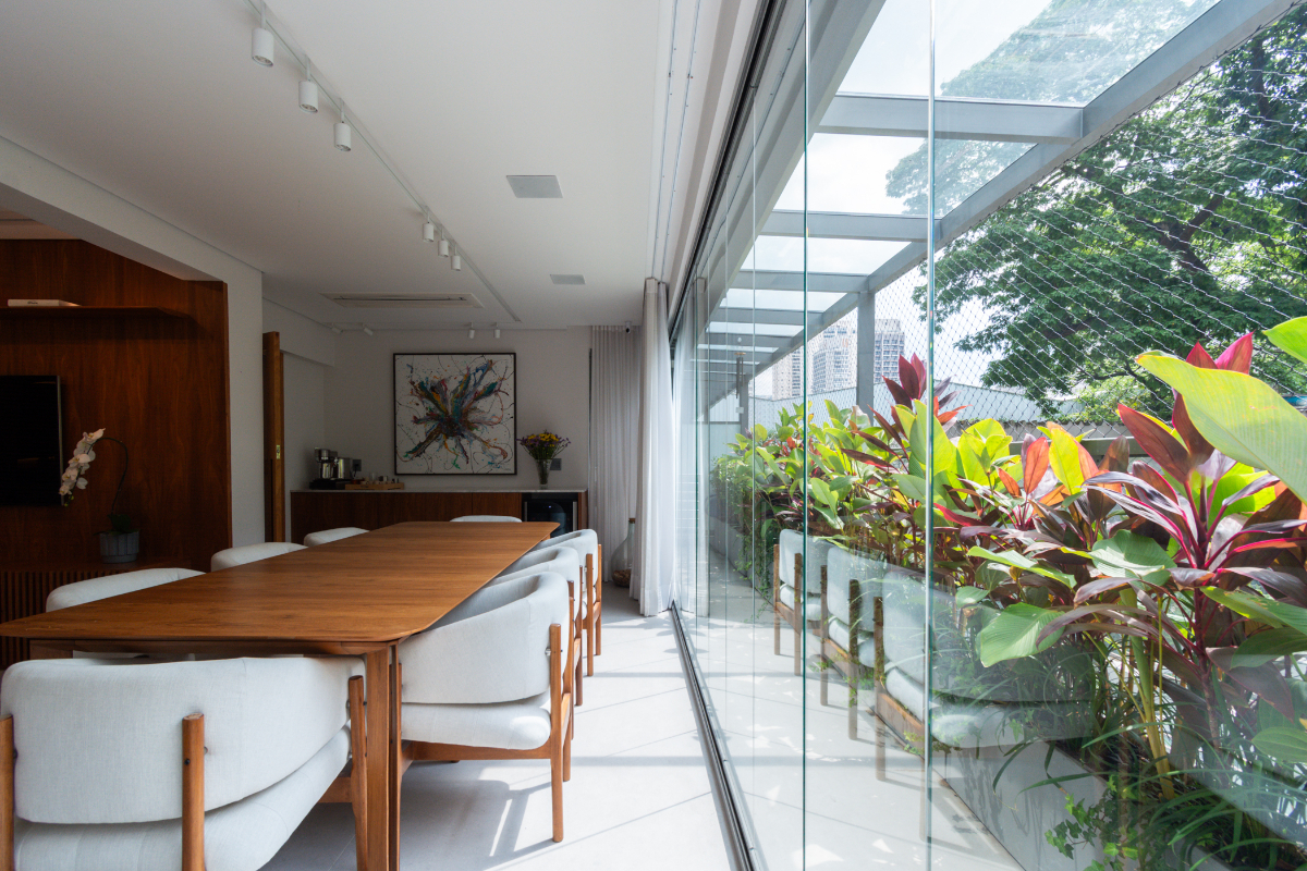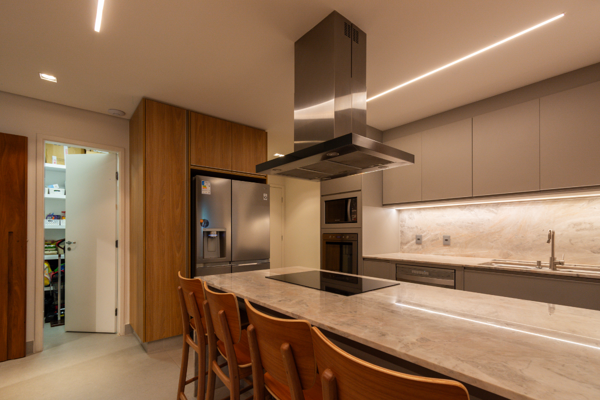 São 4 dormitórios (sendo 3 suítes e um escritório), além de lavabo, living espaçoso, cozinha moderna com ilha, área de serviço, banheiro de serviço, depósito privativo e 3 vagas de garagem, além do hall privativo.