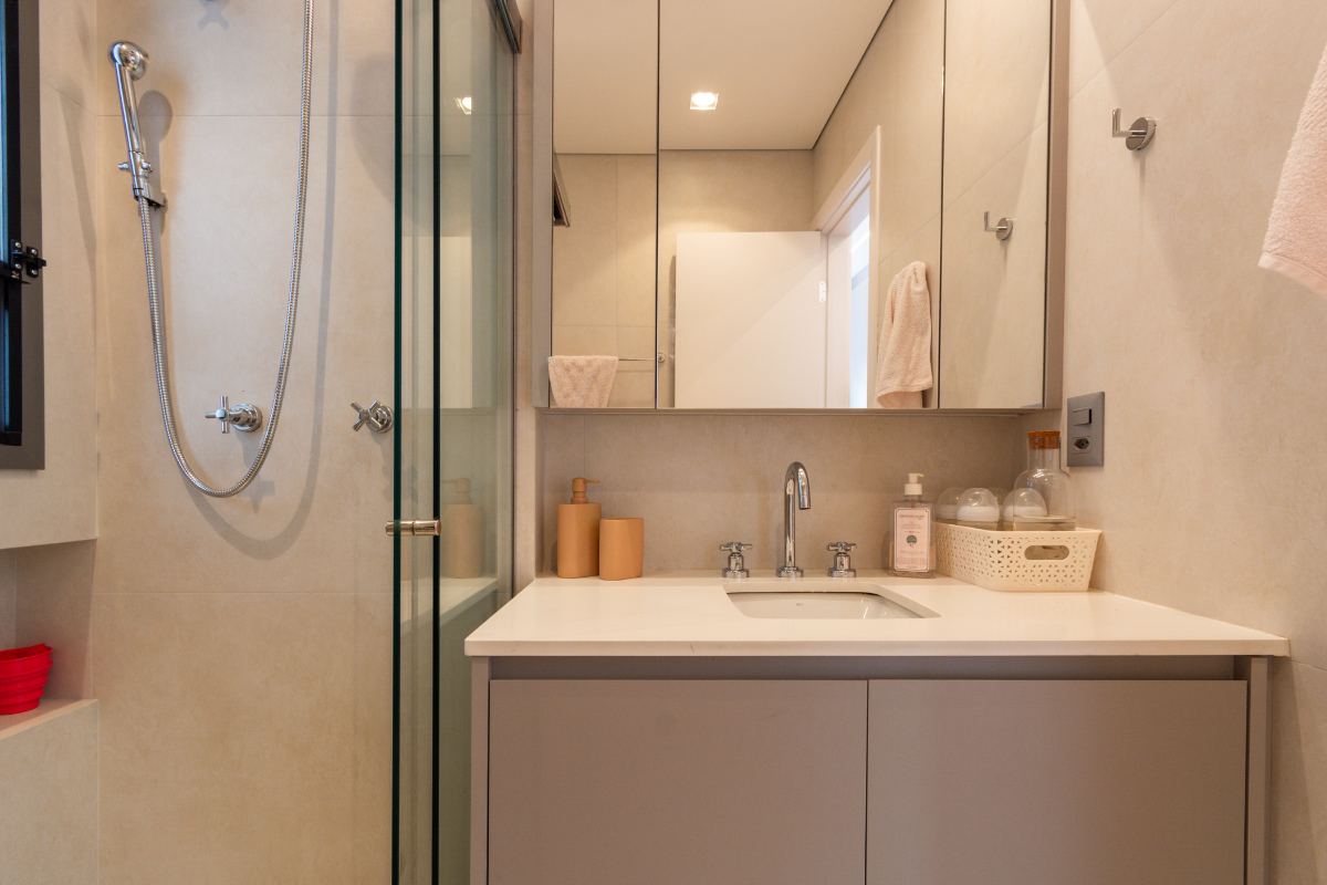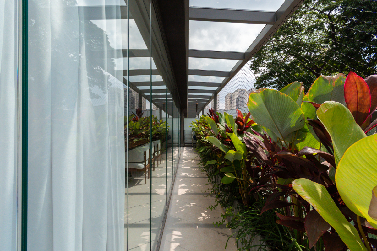 A suíte master conta com banheiro sr e sra, e um amplo closet, com uma linda vista para a copa das árvores.