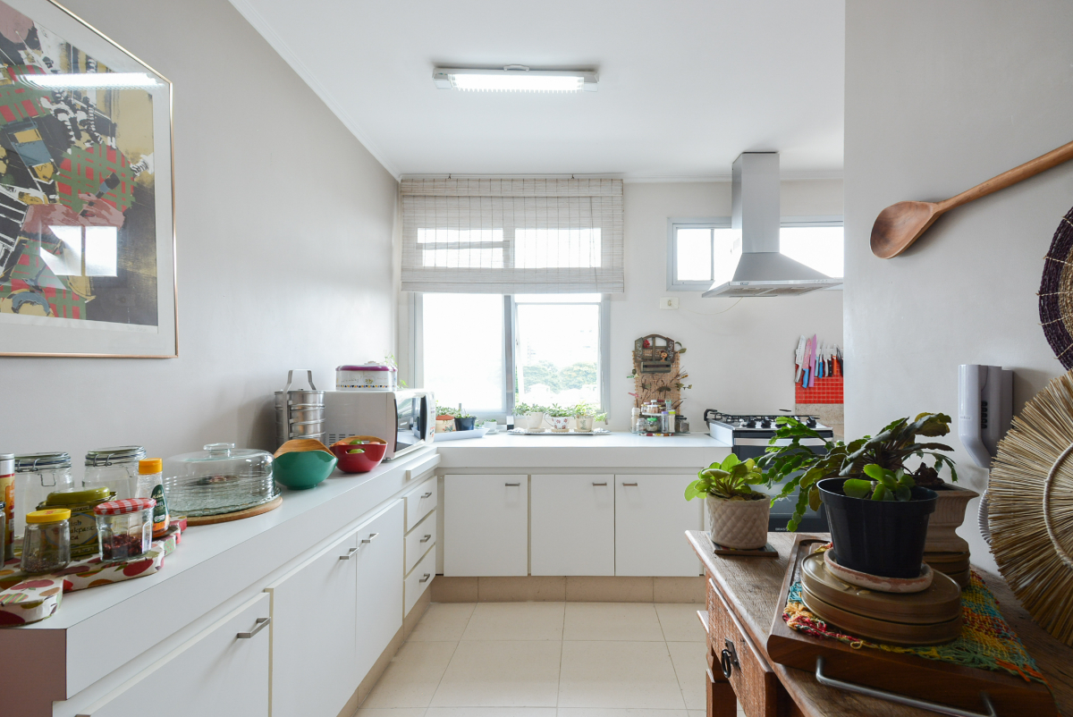 A cozinha é ampla, aconchegante e bem ventilada naturalmente, equipada com armários planejados de altíssima qualidade. A sala possui amplas janelas duplas, garantindo excelente iluminação e ventilação, com sol da manhã em todos os cômodos.