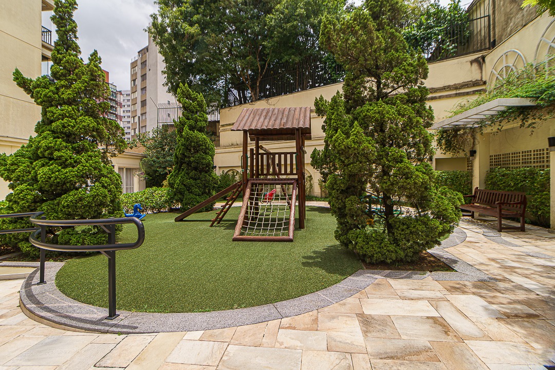 Uma ampla área de lazer com jardim e playground para as crianças.