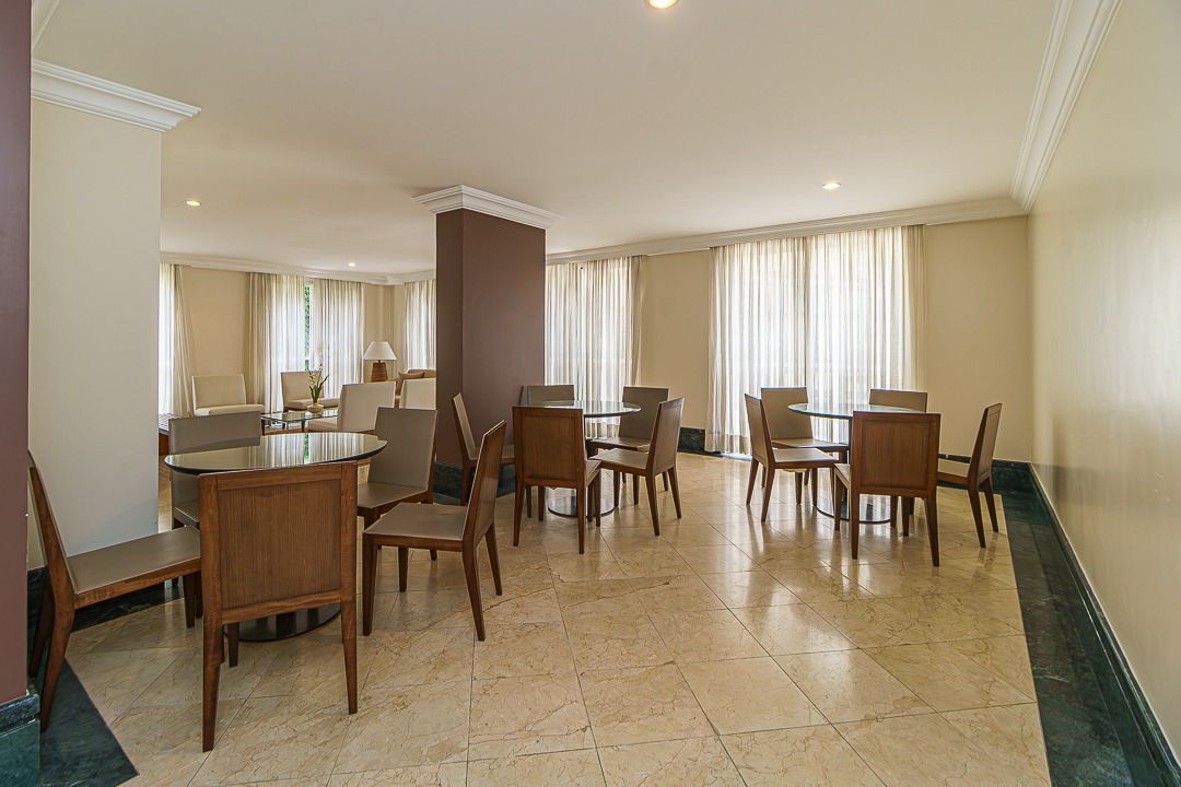 Possui salão de festas decorado e sala para jogos.
