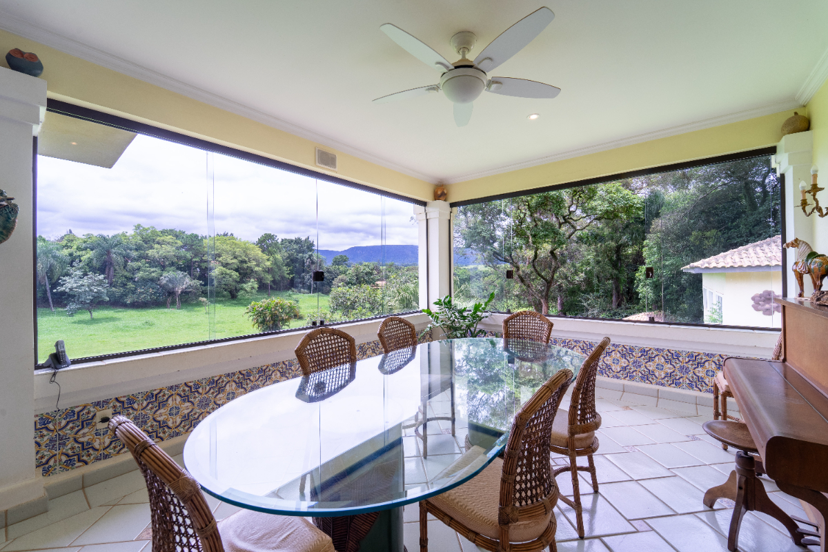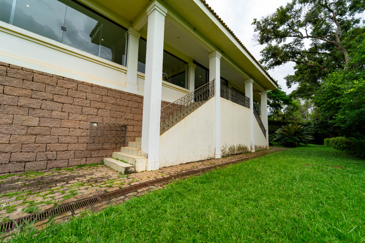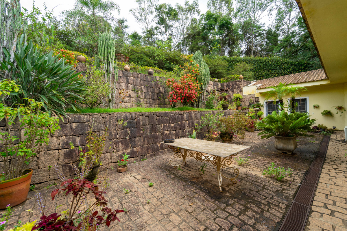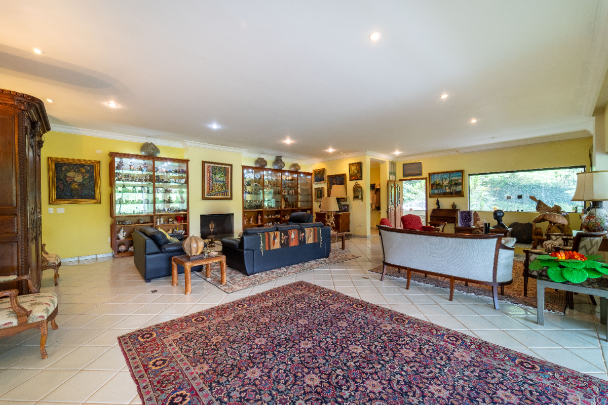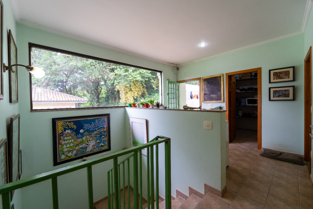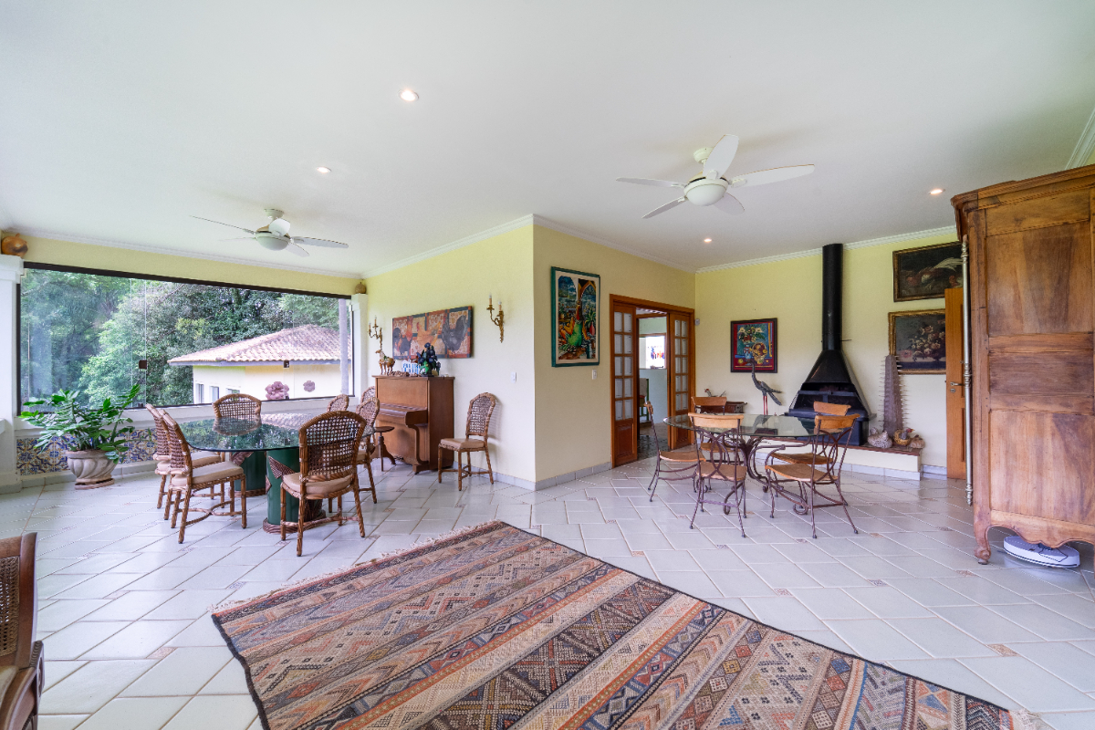 O destaque é o casarão principal, com cerca de 600 m² de área construída. Ele conta com sala principal avarandada e integrada em 5 ambientes, vista deslumbrante para a Serra do Japi, lareiras, sala de jantar, sala de TV, escritório, biblioteca, 3 suítes com portas-balcão para jardim de inverno em pedras, quarto de funcionária, cozinha ampla com armários planejados, despensa, lavanderia, banheiros sociais e garagem coberta para três veículos. O piso inferior ainda abriga 5 salas multifuncionais.