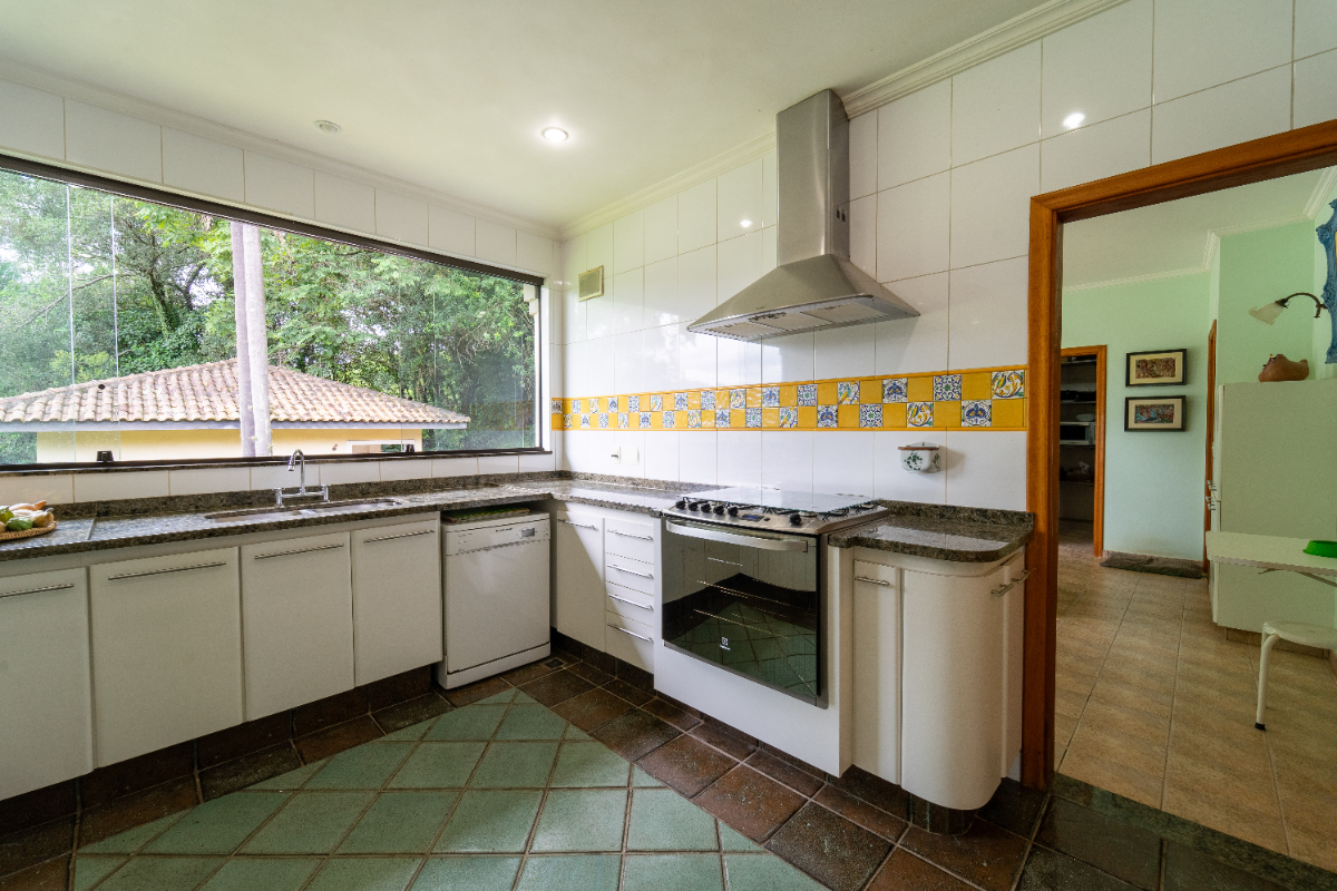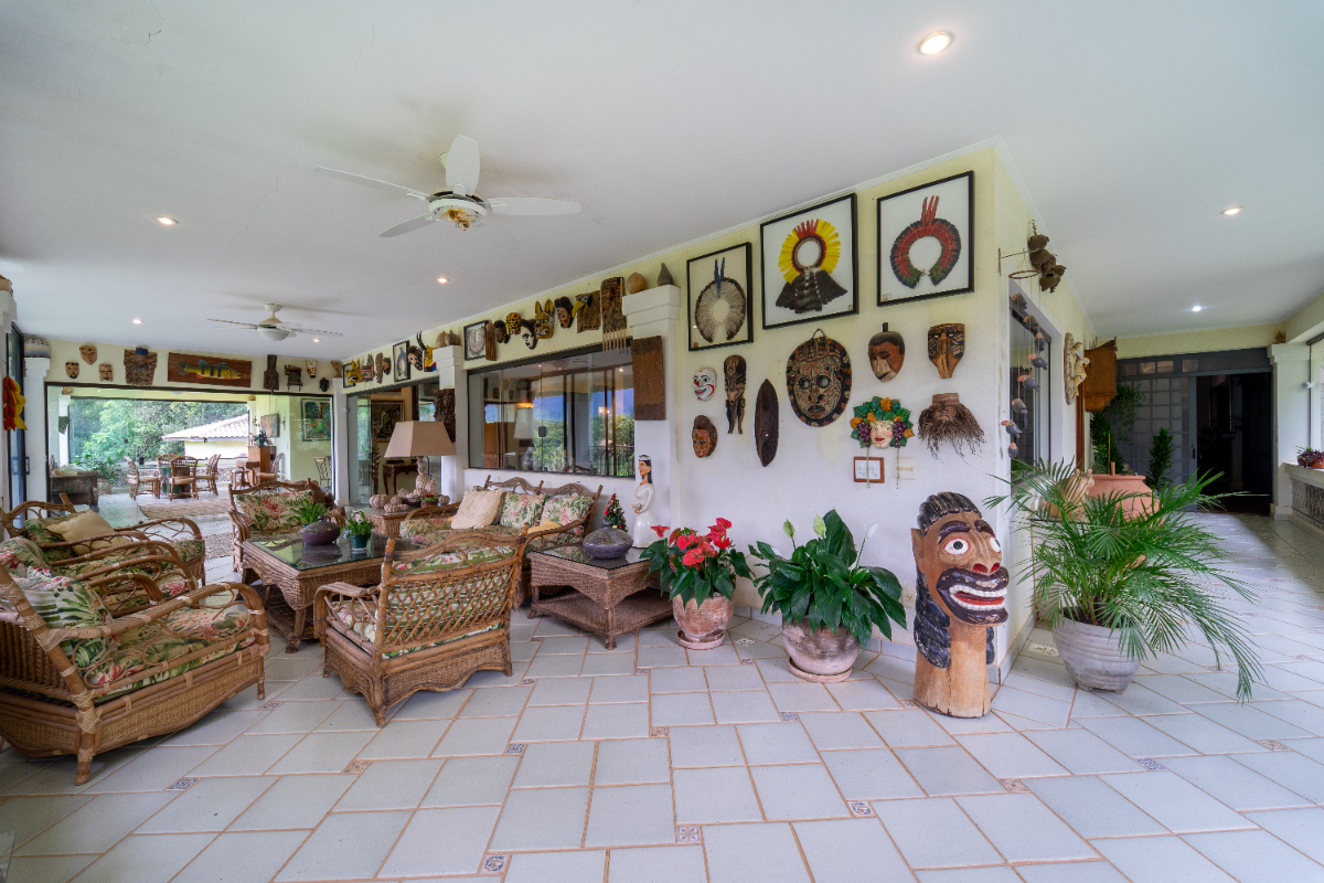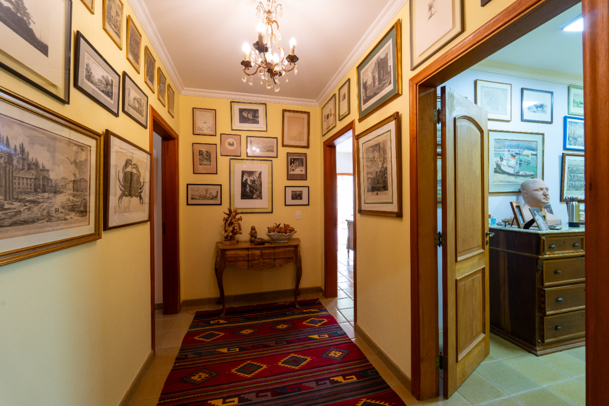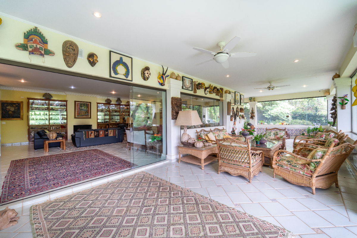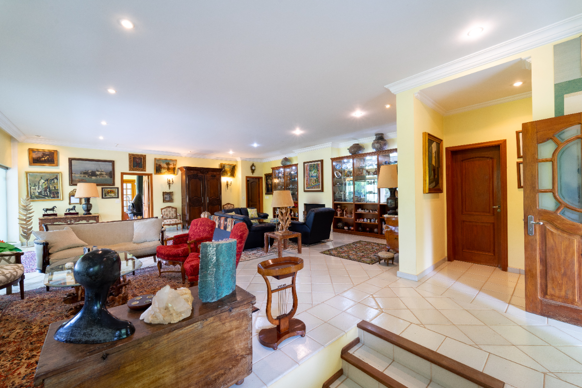 O destaque é o casarão principal, com cerca de 600 m² de área construída. Ele conta com sala principal avarandada e integrada em 5 ambientes, vista deslumbrante para a Serra do Japi, lareiras, sala de jantar, sala de TV, escritório, biblioteca, 3 suítes com portas-balcão para jardim de inverno em pedras, quarto de funcionária, cozinha ampla com armários planejados, despensa, lavanderia, banheiros sociais e garagem coberta para três veículos. O piso inferior ainda abriga 5 salas multifuncionais.