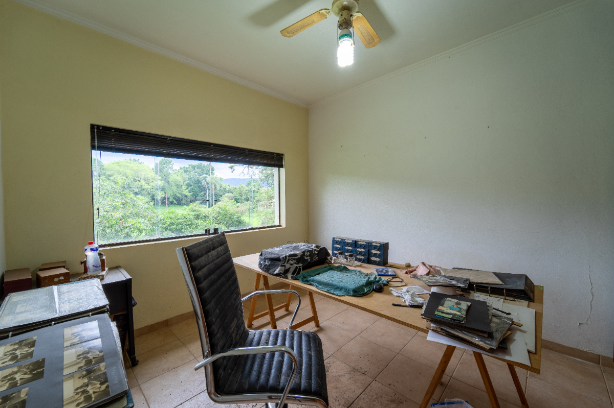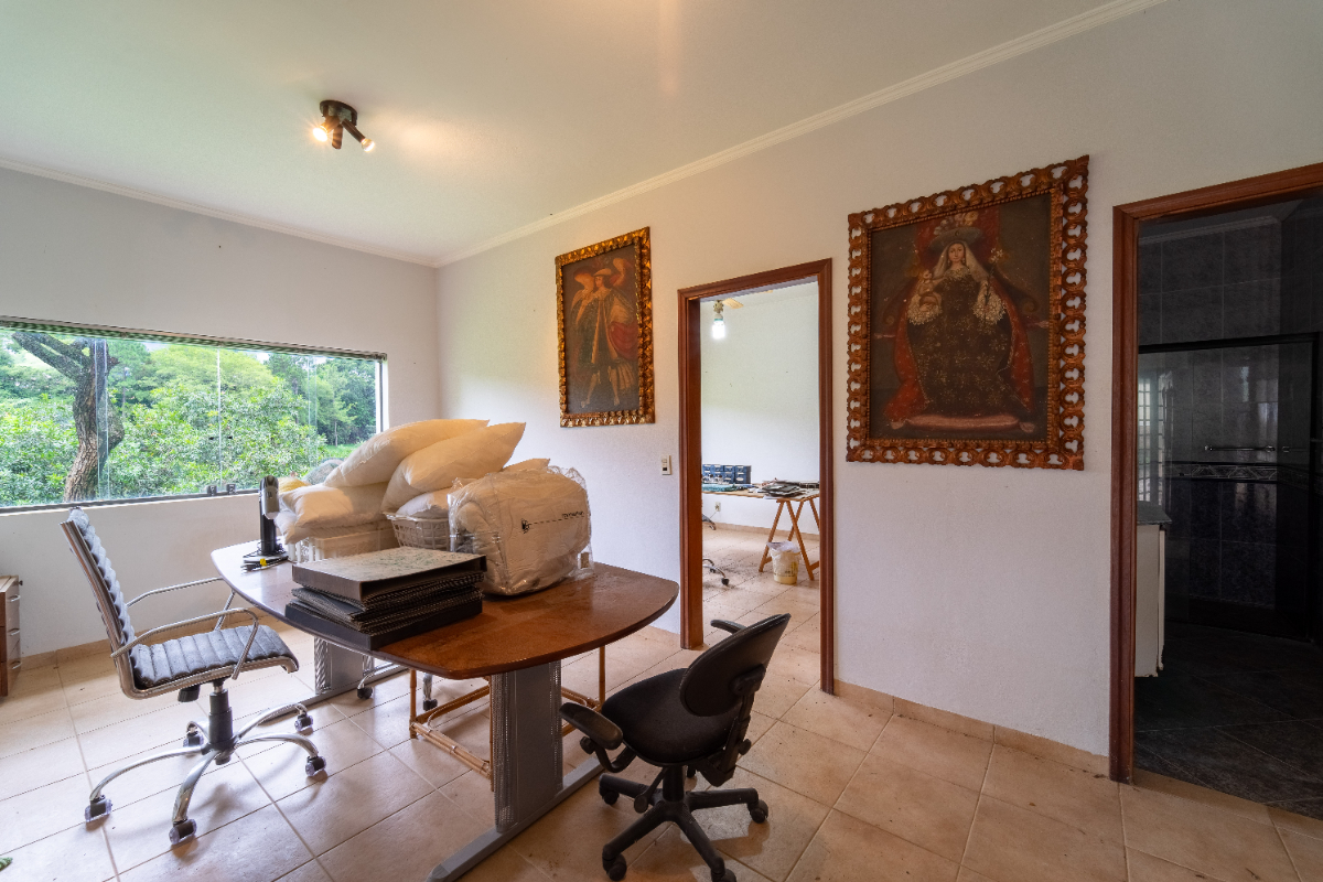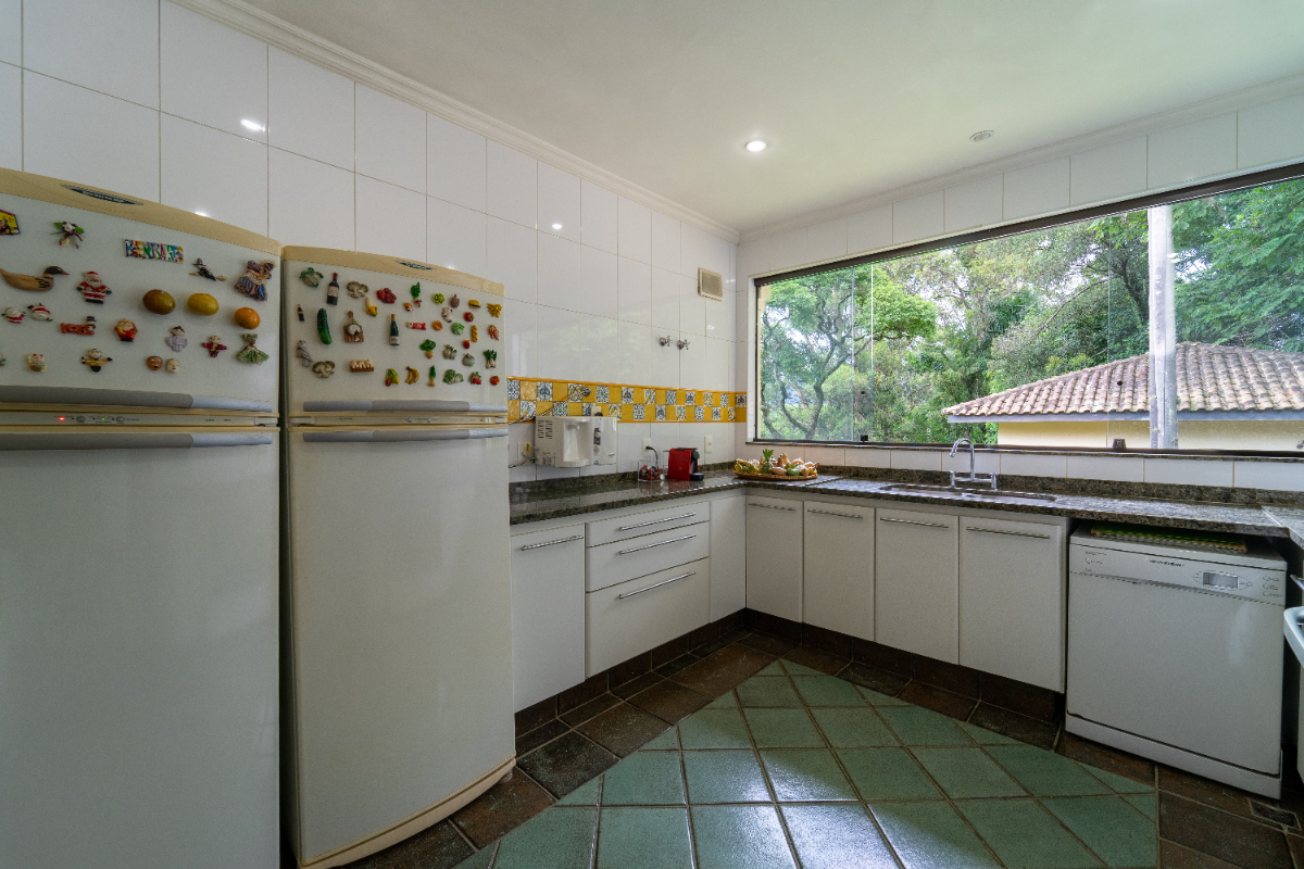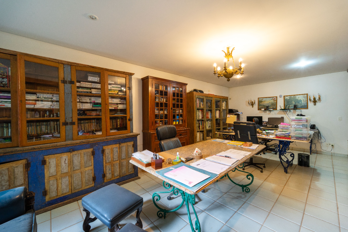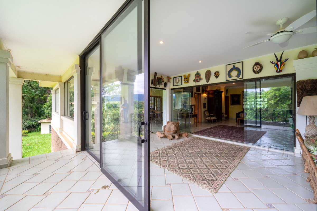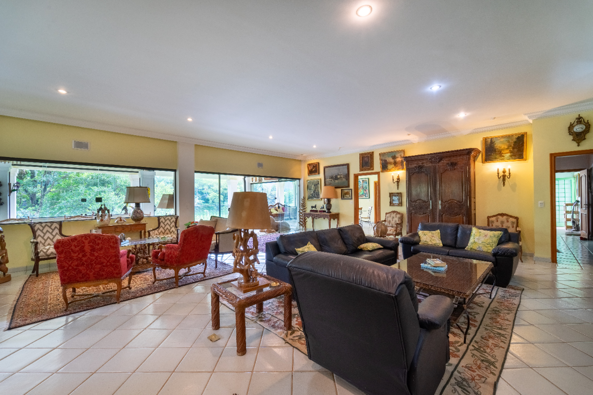 O destaque é o casarão principal, com cerca de 600 m² de área construída. Ele conta com sala principal avarandada e integrada em 5 ambientes, vista deslumbrante para a Serra do Japi, lareiras, sala de jantar, sala de TV, escritório, biblioteca, 3 suítes com portas-balcão para jardim de inverno em pedras, quarto de funcionária, cozinha ampla com armários planejados, despensa, lavanderia, banheiros sociais e garagem coberta para três veículos. O piso inferior ainda abriga 5 salas multifuncionais.