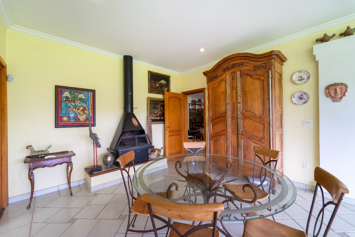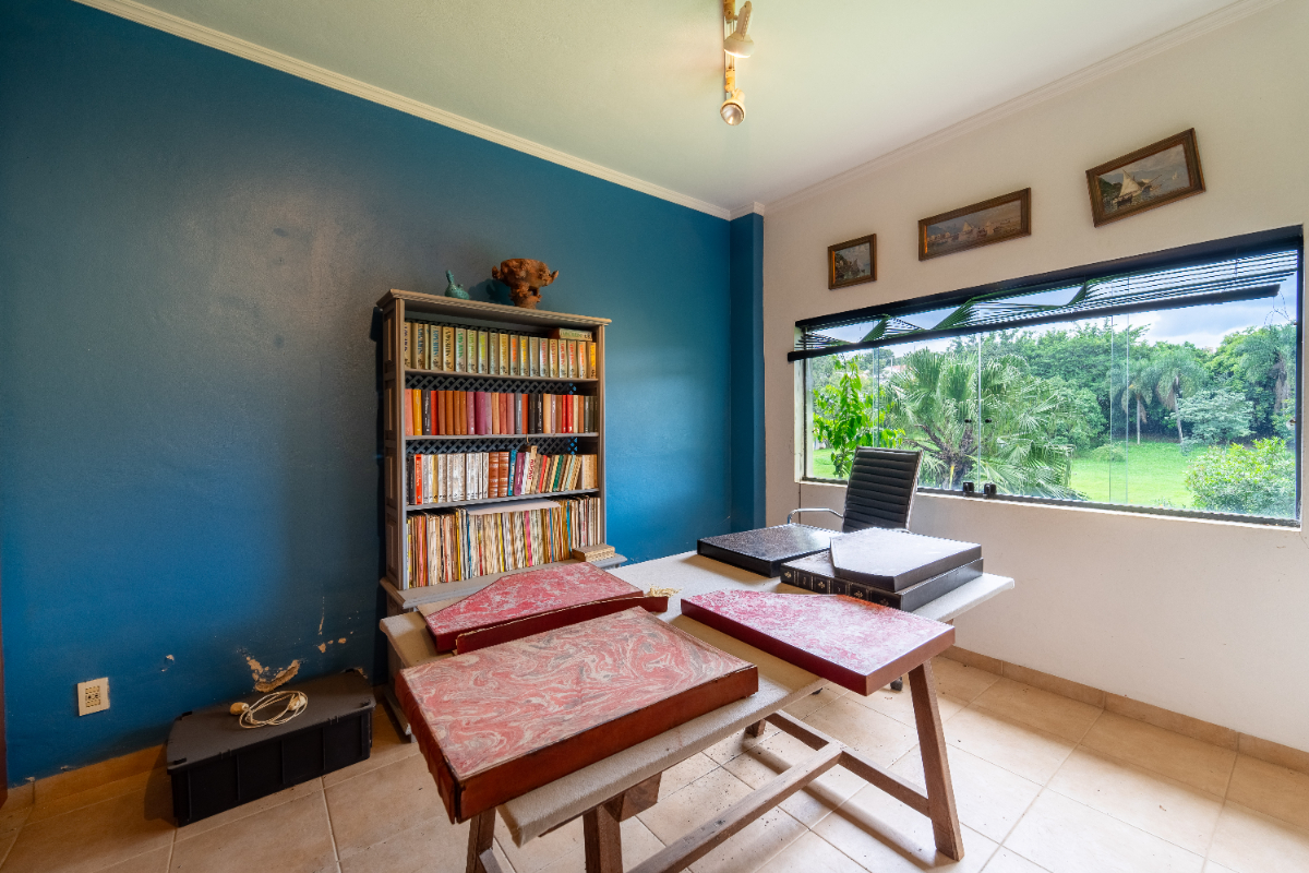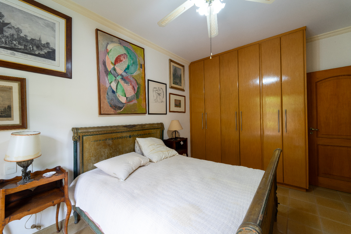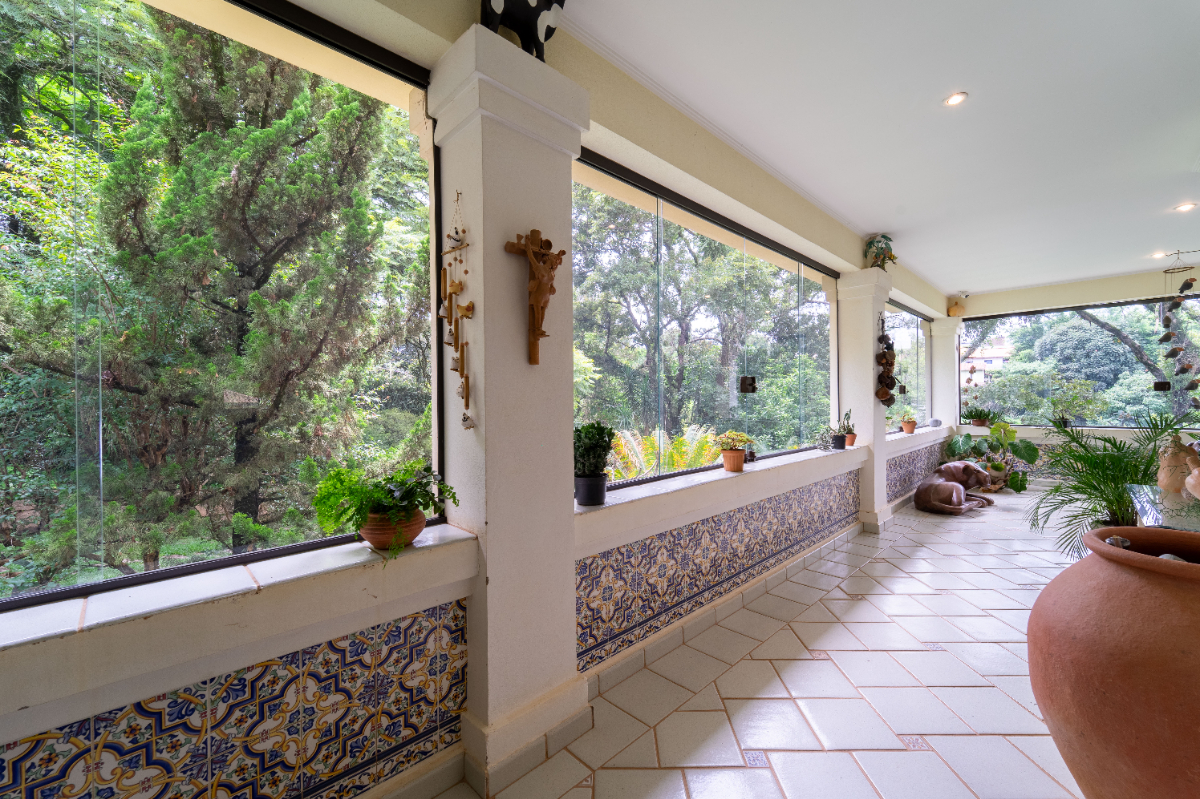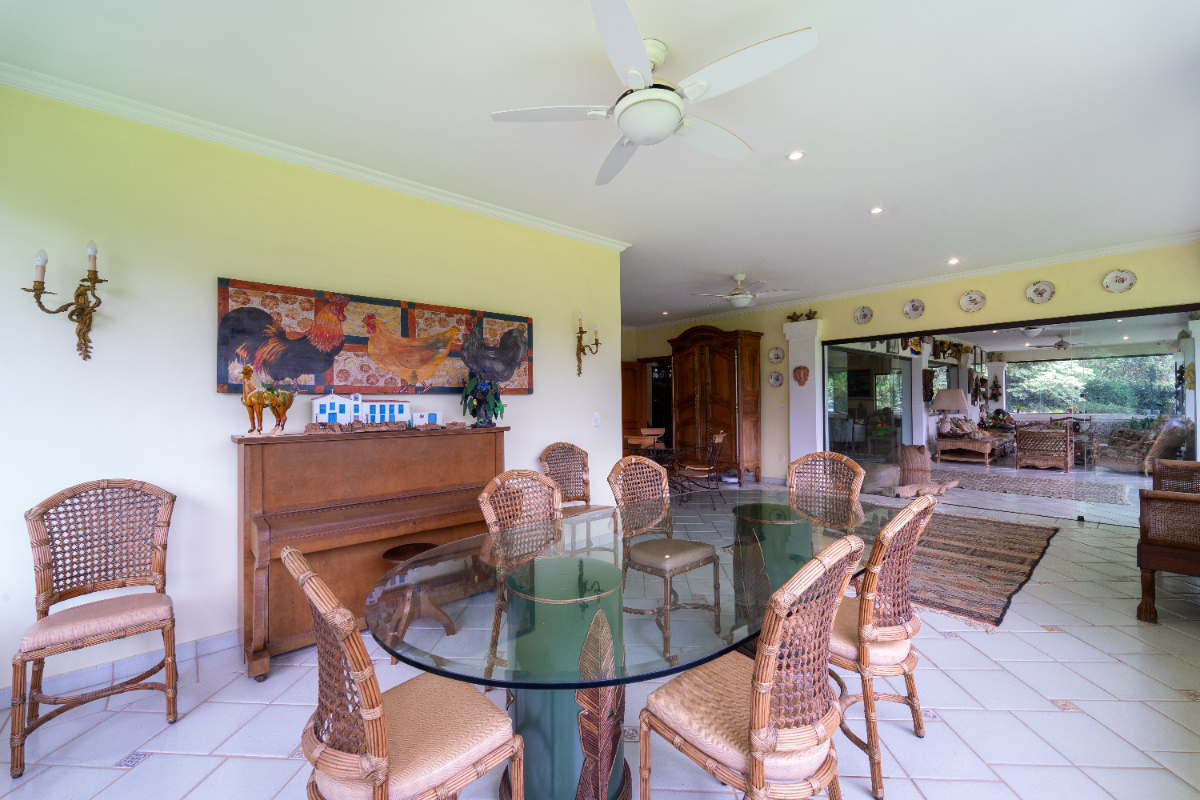 O destaque é o casarão principal, com cerca de 600 m² de área construída. Ele conta com sala principal avarandada e integrada em 5 ambientes, vista deslumbrante para a Serra do Japi, lareiras, sala de jantar, sala de TV, escritório, biblioteca, 3 suítes com portas-balcão para jardim de inverno em pedras, quarto de funcionária, cozinha ampla com armários planejados, despensa, lavanderia, banheiros sociais e garagem coberta para três veículos. O piso inferior ainda abriga 5 salas multifuncionais.